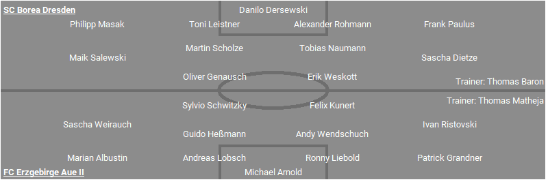 FC Erzgebirge Aue II: Michael Arnold - Patrick Grandner, Ronny Liebold, Andreas Lobsch, Marian Albustin - Andy Wendschuch, Guido Heßmann, Ivan Ristovski, Sascha Weirauch - Felix Kunert, Sylvio Schwitzky; Trainer: Thomas Matheja