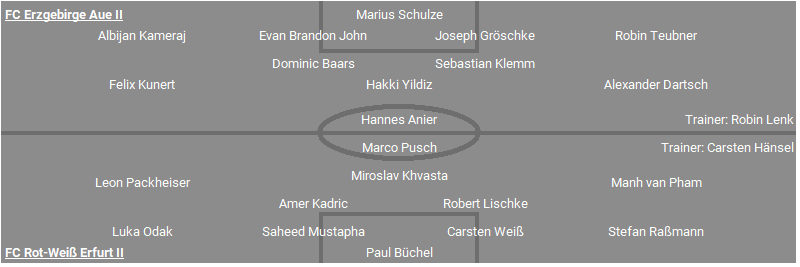 FC Erzgebirge Aue II: Marius Schulze - Albijan Kameraj, Evan Brandon John, Joseph Gröschke, Robin Teubner - Dominic Baars, Sebastian Klemm, Felix Kunert, Hakki Yildiz, Alexander Dartsch - Hannes Anier; Trainer: Robin Lenk
