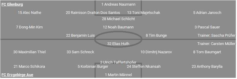 FC Eilenburg: Andreas Naumann - Alec Nathe, Raimison Draiton Dos Santos, Toni Majetschak, Adrian Jarosch - Michael Schlicht, Dong-Min Kim, Noah Baumann, Pascal Sauer - Benjamin Luis, Tim Bunge; Trainer: Sascha Prüfer