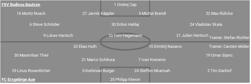 FSV Budissa Bautzen: Ondrej Cap - Moritz Noack, Jannik Käppler, Michal Brandl, Max Rülicke - Steve Schröder, Drilon Halilaj, Vladislav Skala - Lukas Hanisch, Tom Hagemann, Julien Hentsch; Trainer: Stefan Richter